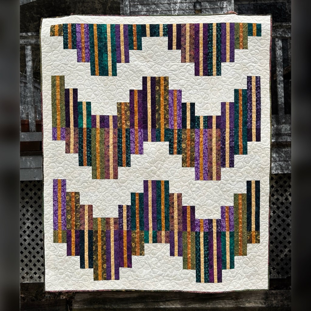 I took a modern twist on the Dresden challenge, using the Midnight Garden collection. This used the Grandma’s Fan Die from Accuquilt. It’s funny that after this project (which I have 2 more quilts cut from this line needing assembled), I told Island Batik I was all “purpled out.” But, I have since then found myself gravitating to all the purple options from my nail polish, to my software color settings, even my pen ink!