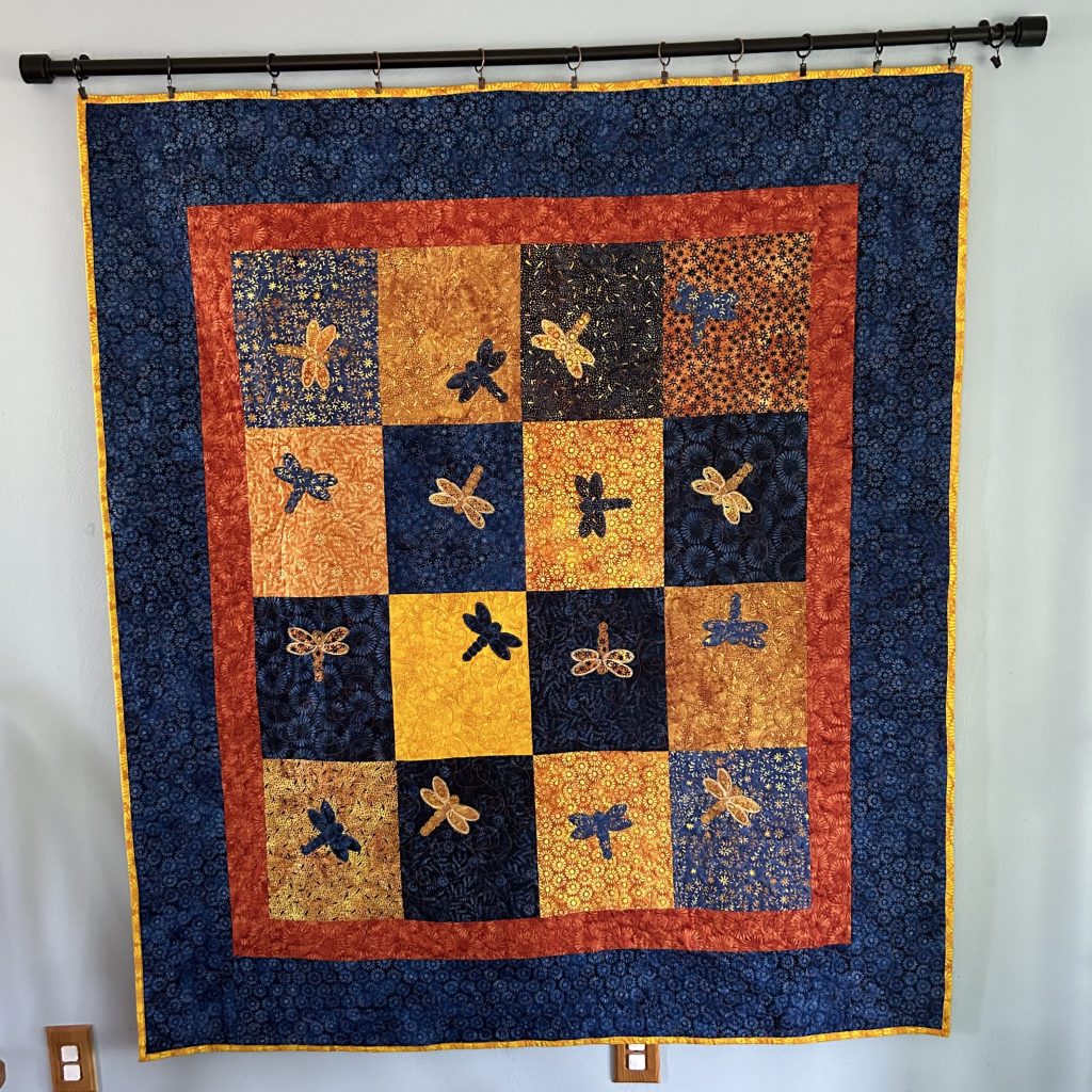 Adventurous Appliqué Blog Hop was a challenge to try thread painting on appliqué. I made this dragonfly quilt with the Twilight Collection. I’ve put this quilt on our sun porch and it’s been an extra source of sunniness as we relax and enjoy rainy afternoons.
